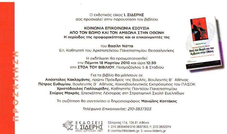 Κοινωνία, επικοινωνία, εξουσία: Από τον Βωμό και τον Άμβωνα στην οθόνη. Η περίοδος της προφορικότητας και οι επικοινωνητές της. Μια κοινωνιολογική προσέγγιση στην ιστορία της επικοινωνίας και των μέσων. Εκδότης: Ι. Σιδέρης. Συγγραφέας: Βασίλης Νόττας. Σειρά: Δημοσιογραφία και ΜΜΕ. Έτος έκδοσης: 2009 . ISBN: 960-08-0468-0. Τόπος Έκδοσης: Αθήνα Αριθμός Σελίδων: 302 Διαστάσεις: 24χ17 Πρόλογος: Κώστας Βεργόπουλος. Αποσπάσματα στο Ιστολογοφόρο: κλίκ στην εικόνα