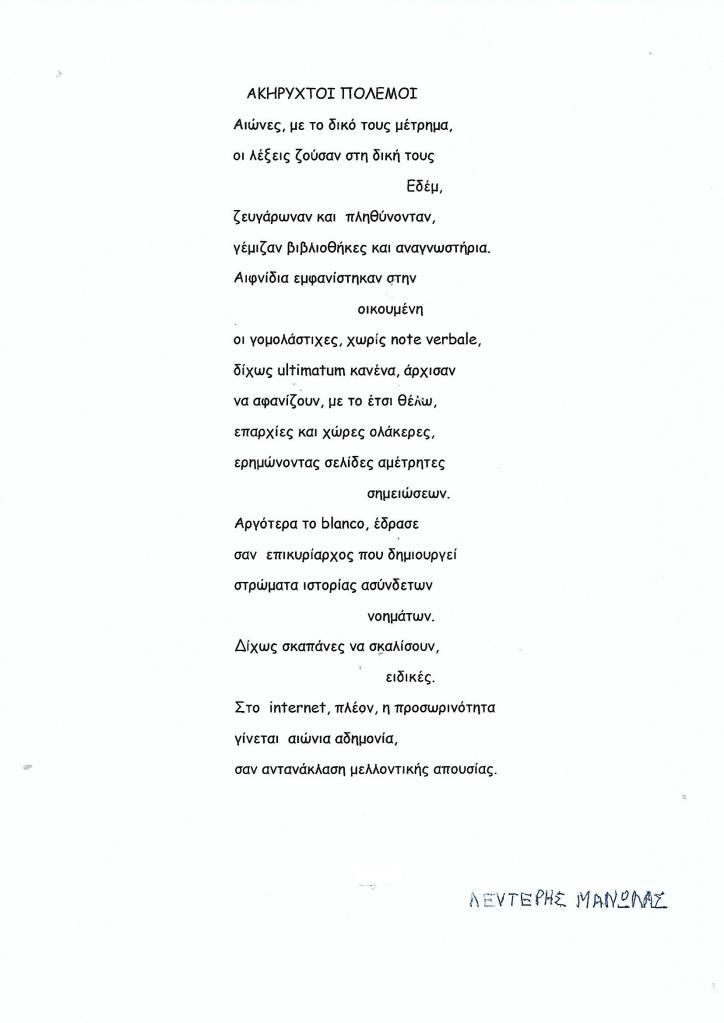 Posted in ΠΟΙΗΜΑΤΑ, ΣΥΓΓΡΑΦΙΚΑ ΦΙΛΩΝ, ΤΑ ΤΡΕΧΟΝΤΑ | Με ετικέτα: Λευτέρης Μανωλάς | Leave a Comment »